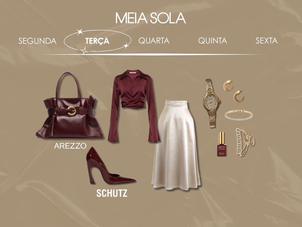 Aqui a ideia é combinar sofisticação com um toque clássico. Que tal uma camisa, uma saia midi de seda e um scarpin? Esse mix cria um look chic e prático, perfeito para um dia de reunião!