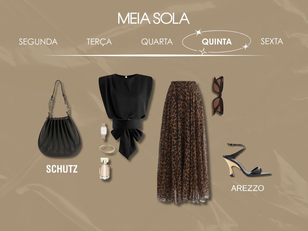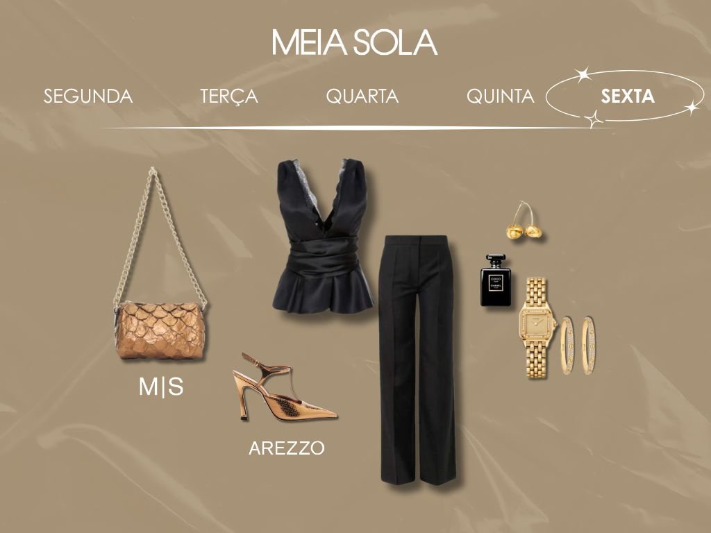 Sexta pede um look poderoso, né? Aposte no all black e deixe o brilho por conta dos brincos e colares, que garantem um glow extra. Nos pés, um salto alto para fechar o visual com estilo e pronta para arrasar do trabalho ao happy hour!
