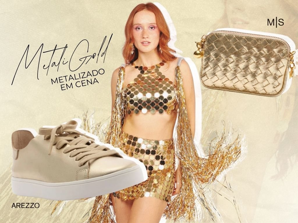 O metalizado nunca sai de cena, mas em 2026 ele vem com uma pegada Liquid Metal, moderna e futurista. Combine com body chains, uma mini bag e um tênis super comfy pra equilibrar brilho e conforto.